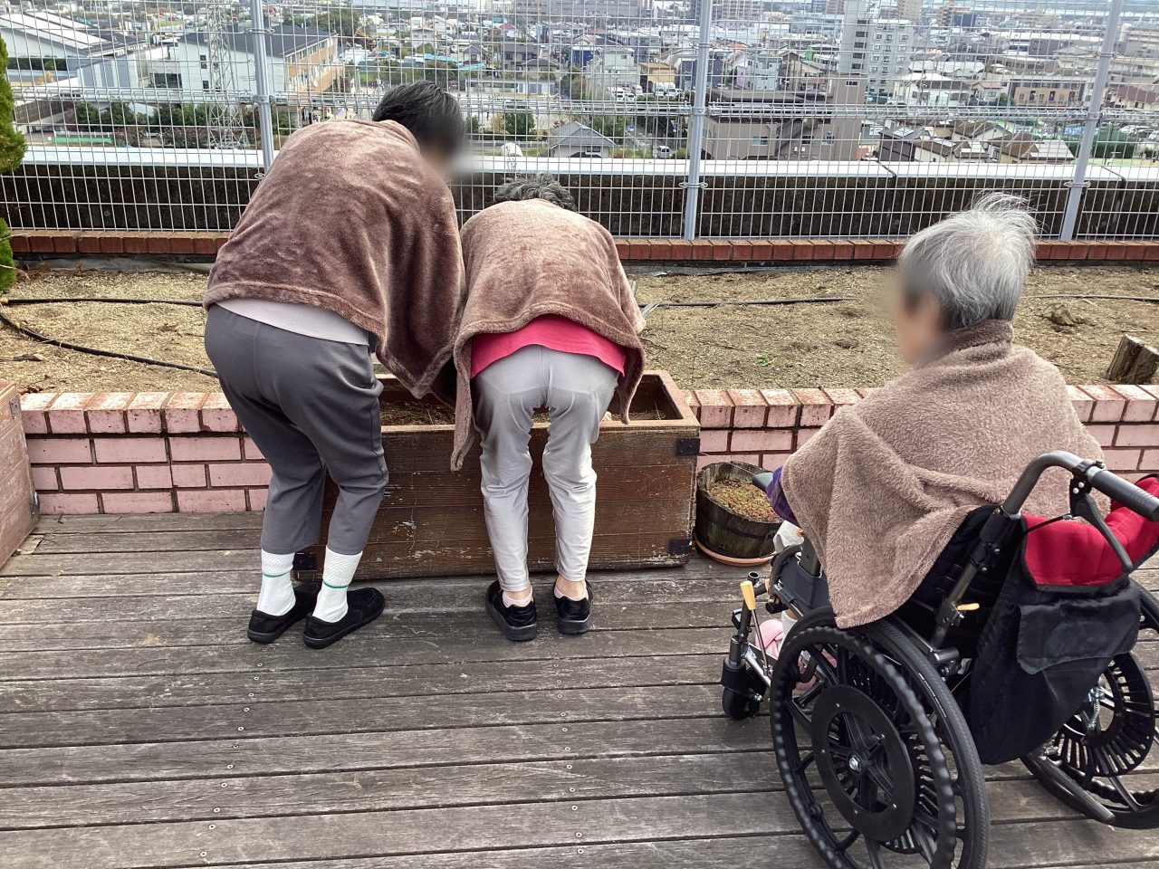 「土を見ると触りたくなっちゃうのよね」と庭いじりがお好きなお二人は一番にプランター向かわれ、黙々とお手入れをしてくださいました。