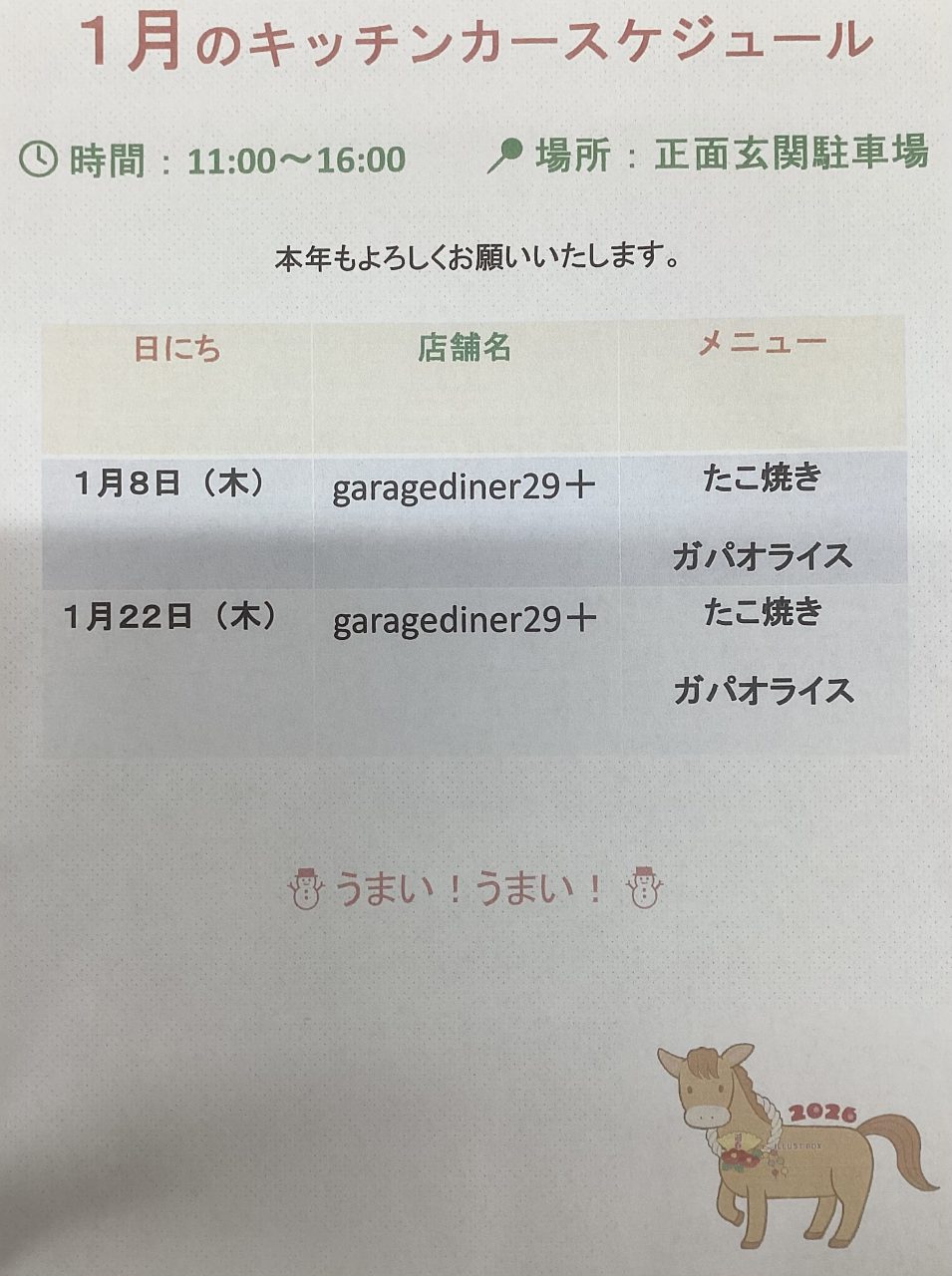1月キッチンカースケジュール 2026.01.06│トピックス 和光病院の正面玄関駐車場で販売しています♪ ぜひお立ち寄りください♪ 絵馬を掲示しました ARCHIVES 2026.1 2025.12 2025.11 2025.10 2025.9 2025.8 2025.7 2025.6 2025.5 2025.4 2025.3 2025.2 2025.1 2024.12