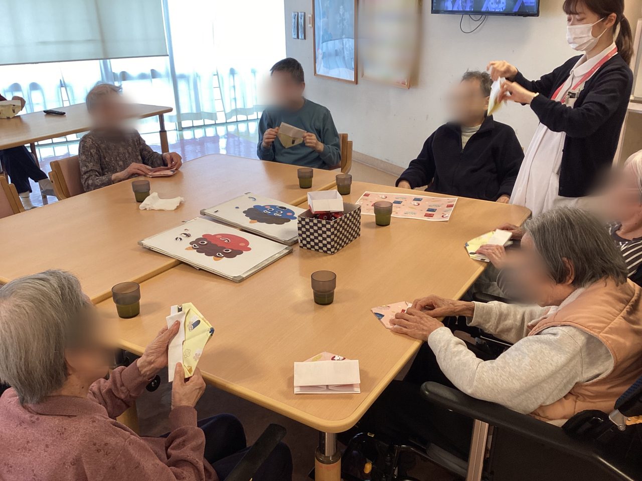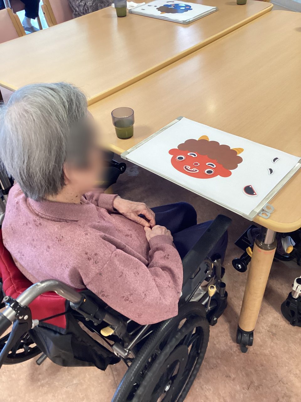 近くの患者さんと一緒に協力し、各パーツをアレンジされながらいろいろな表情の鬼が完成しました。